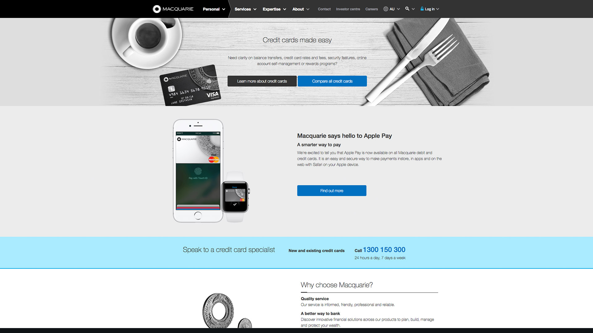 Macquarie Bank – Customer Experience – UI. Working with DT to help the full rollout, of main templates design and thinking for home loans, credit cards, and careers. I joined the team mid flow of delivery for the next 8-9 months perfecting the customer experience and adding the human element of design.